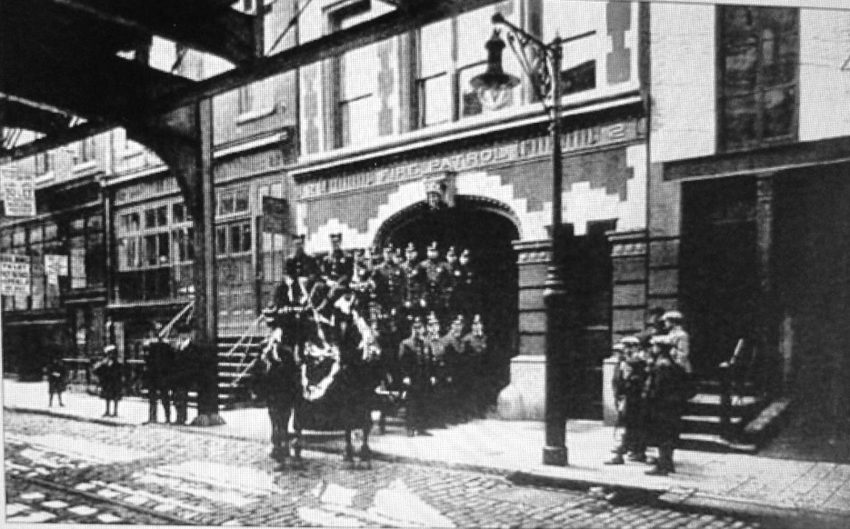 | The Fire Patrol poses outside its new house, below the Third Street elevated train tracks. |