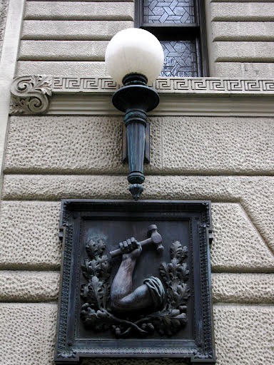 | The Society's symbol, an arm and hammer, hang above a staircase -- photo courtesy C. Russell |