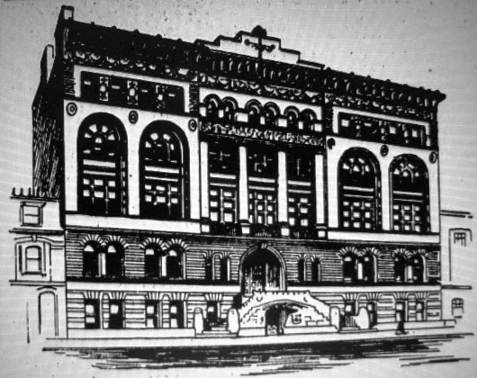 | On May 30, 1891 The Sun printed a sketch of the new building with its grand split staircase to the first floor and the original cornice and parapet (copyright expired) |