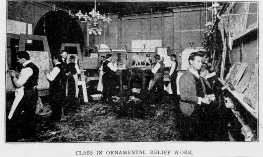 | Young men are instructed in ornamental relief in the newly renovated building -- New York Tribune, January 14, 1900 (copyright expired) |