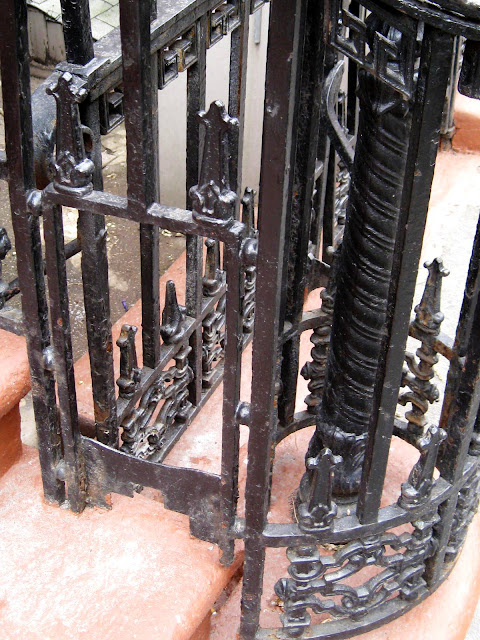 | A bootscraper, worn by a century and a half of muddy shoes, is incorporated into the Greek Revival ironwork. |