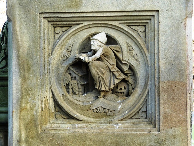 | A witch (above) and a rooster both lost their heads to vandals. Painstaking restoration brought the sculptures back -- photos by Alice Lum |