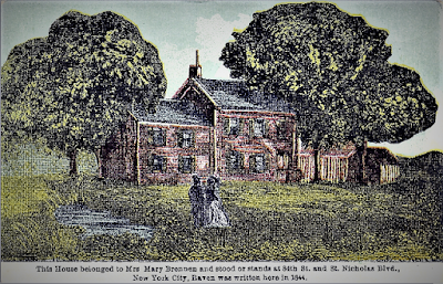 The wooden house was nearly lost during a violent thunderstorm in the spring of 1854. The New York Herald reported on April 27, "The residence of Mr. Patrick Brennan, situated at the corner of Eighty-fourth street and Bloomingdale road, was struck by lightning, and, miraculous to relate, the fluid but merely stunned Mr. Brennan and family, leaving them stupefied for a short time. Every glass in the building was shattered. It then passed from the house, splitting two large trees; running therefrom to a well, breaking up the platform, and evidently passed down the well into the earth."