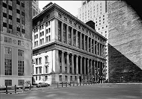 Glorious building, isn't it? An interesting footnote to the McKim Mead & White renovation: At the time of the enlargement, Frank A. Vanderlip was president of National City Bank. For whatever reason, a couple of the Ionic columns were not re-used. Vanderlip had the immense pair hauled to "Beechwood", his estate at Scarborough on the Hudson. His architect, Welles Bosworth, had them partially sunken in the ground at the estate entrance, where they are still on of the astonishing sights along rte 9. Here is a picture of the gates (to understand how gargantuan this entrance is, the iron gates are well over six feet high. https://downeastdilettante.files.wordpress.com/2012/05/img_5391.jpg